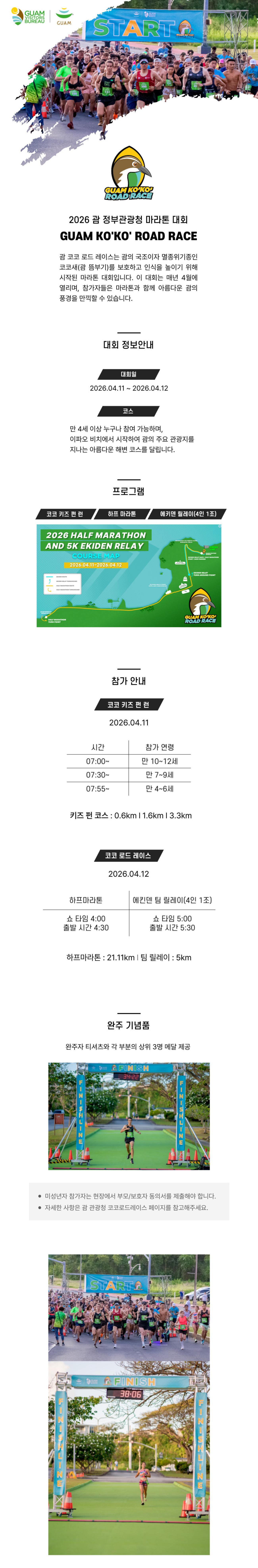 이 행사는 괌의 국조인 코코새의 멸종 위기 인식 개선을 목적으로 하며, 아름다운 괌의 자연 속에서 특별한 경험을 선사하는 마라톤 대회입니다. 가족 단위 참가자들에게도 소중한 추억을 만들어 줄 수있는 코코 로드 레이스를 참가해 보세요.
